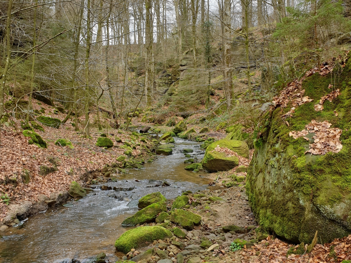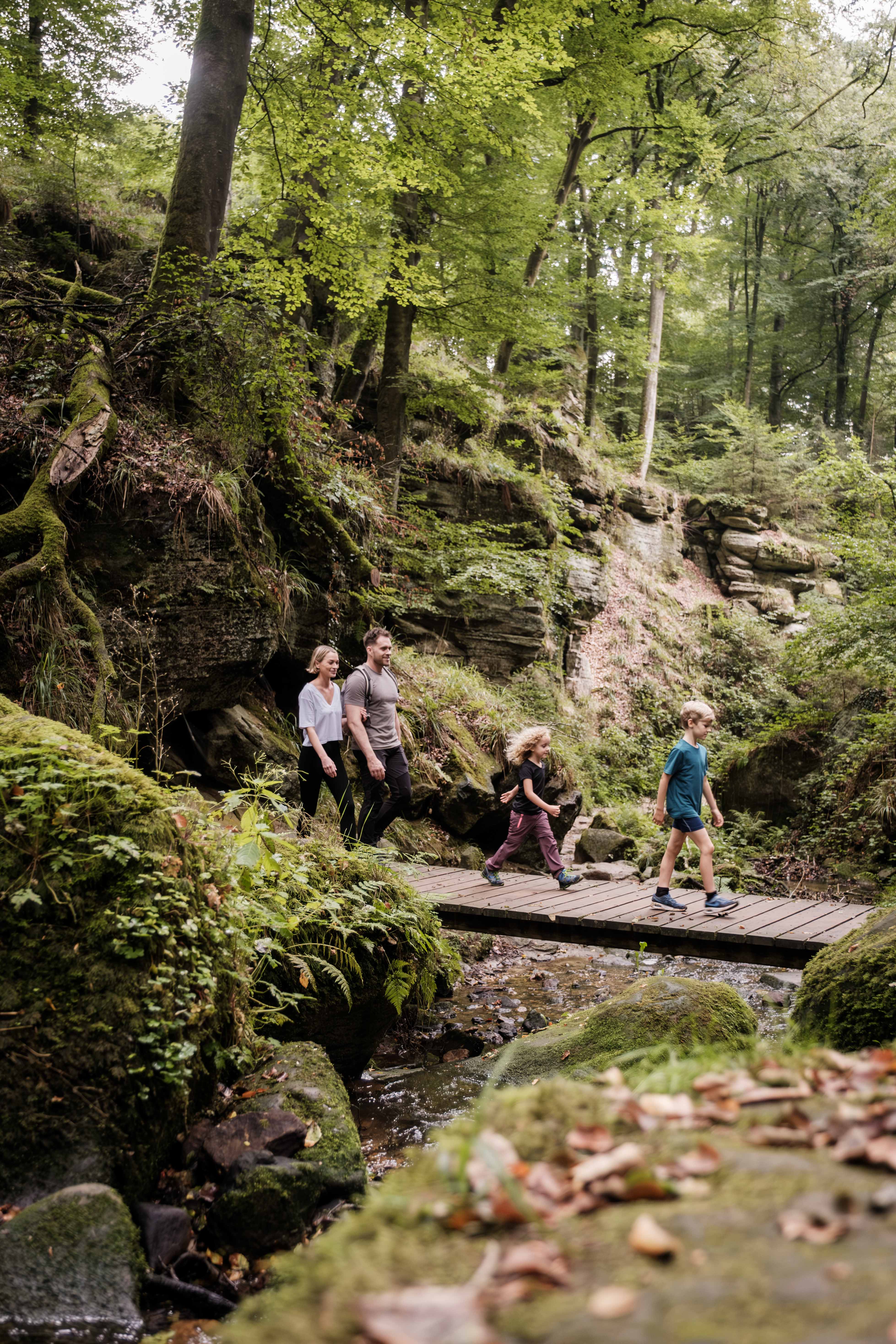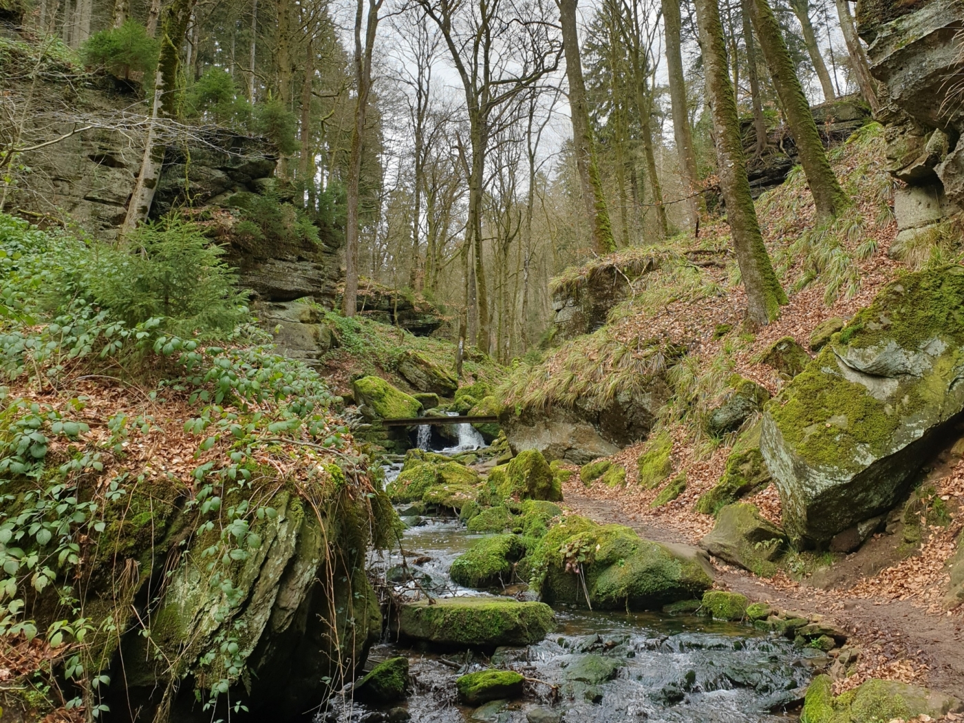 Eine Wanderung entlang der wildromantischen, sprudelnden Bäche Haupeschbaach und Halerbaach führt durch typische, V-förmige Täler. Diese Form entsteht durch die Verwitterung der Felswände. Das verwitterte Material, das von den Felswänden herabfällt, bedeckt den Fuß der steilen Felswände aus Sandstein mit sandigem und steinigem Hangschutt. Zahlreiche Quellen treten aus dem Sandstein aus und speisen die Bäche, sodass die Landschaft vom Wasser geprägt und es im Tal auch an heißen Sommertagen angenehm kühl ist. Den Wanderer erwarten viele kleine Holzbrücken, die den Bach überqueren, und eine einzigartige Landschaft aus moosbewachsenen Felsen.
