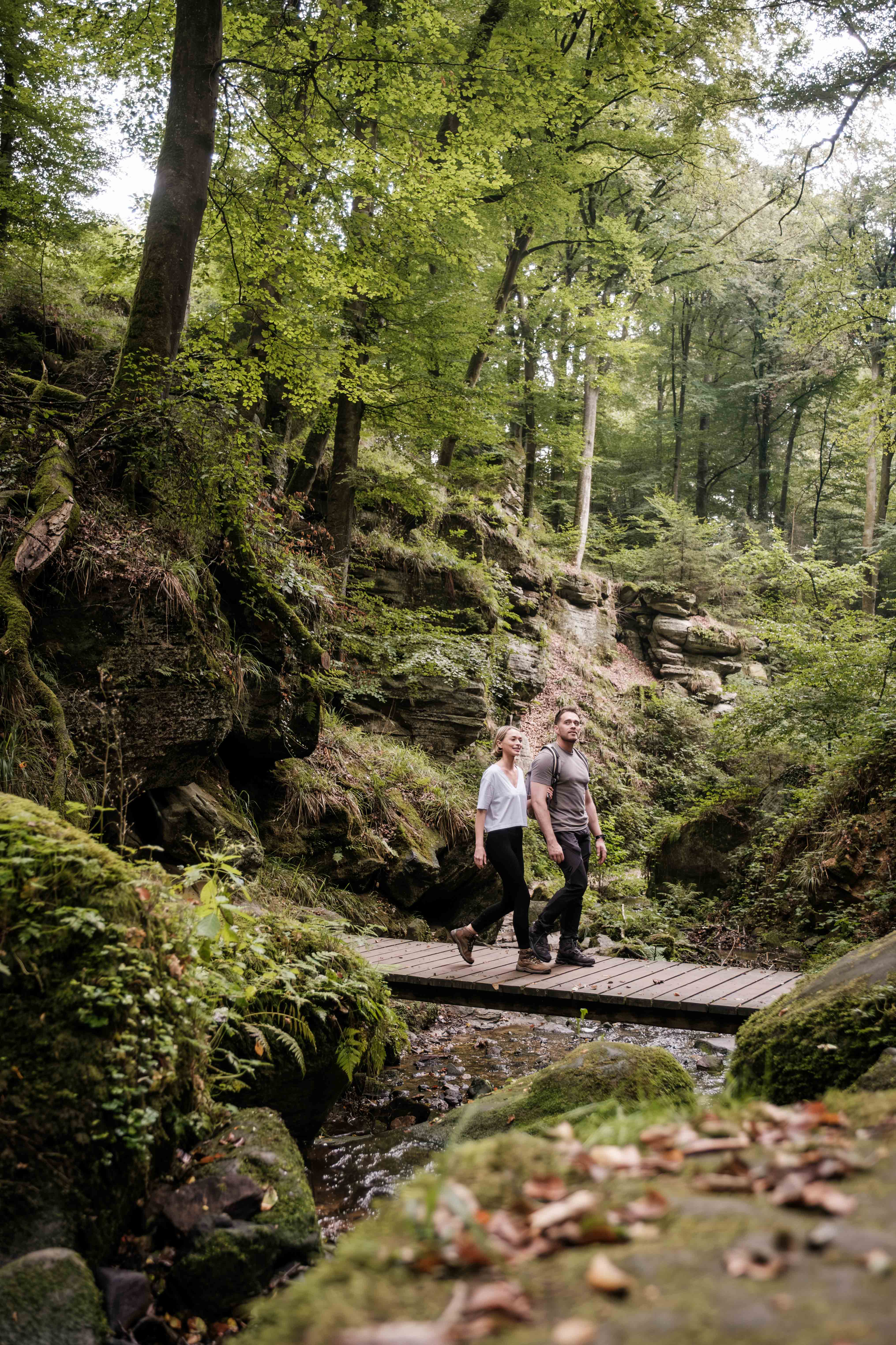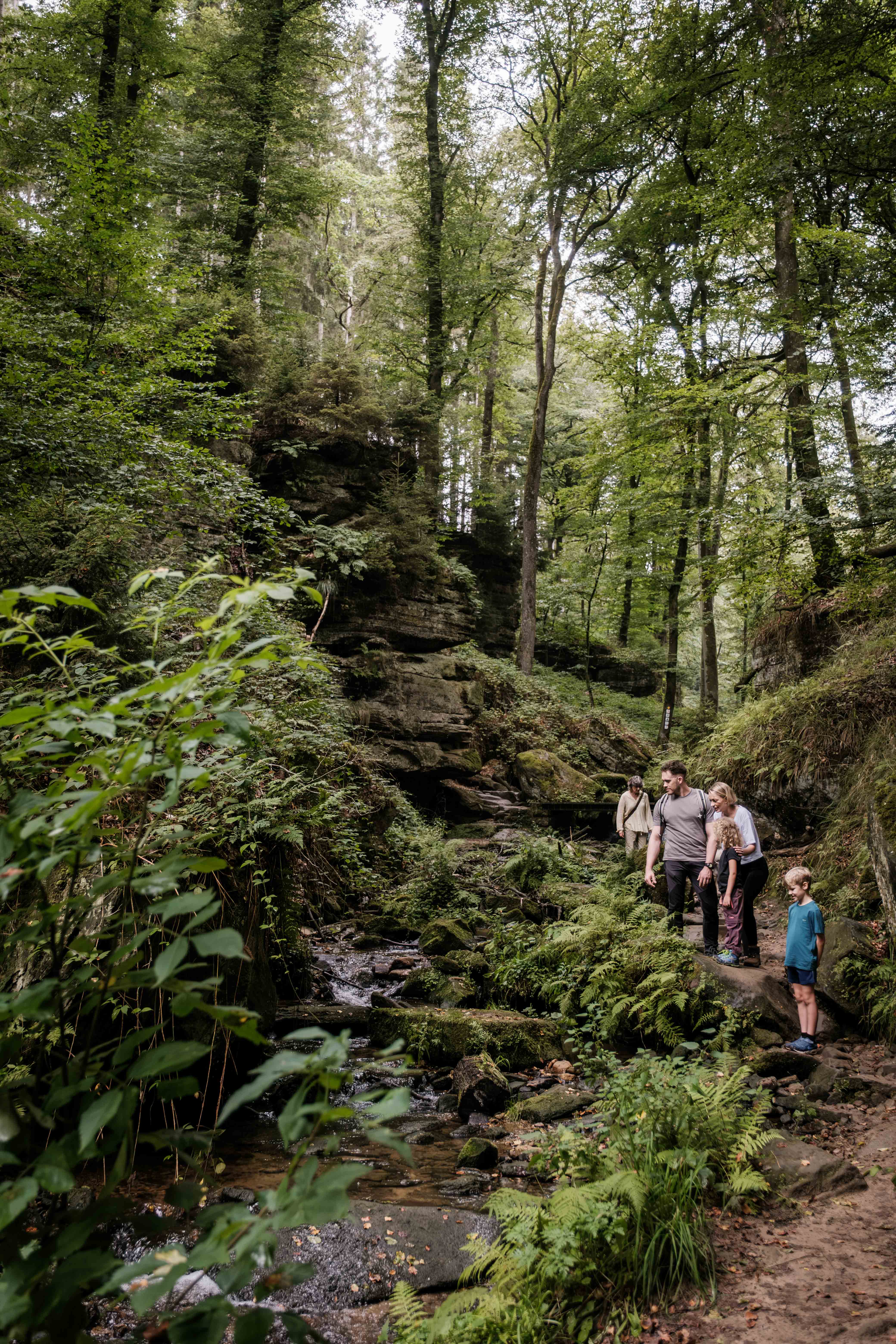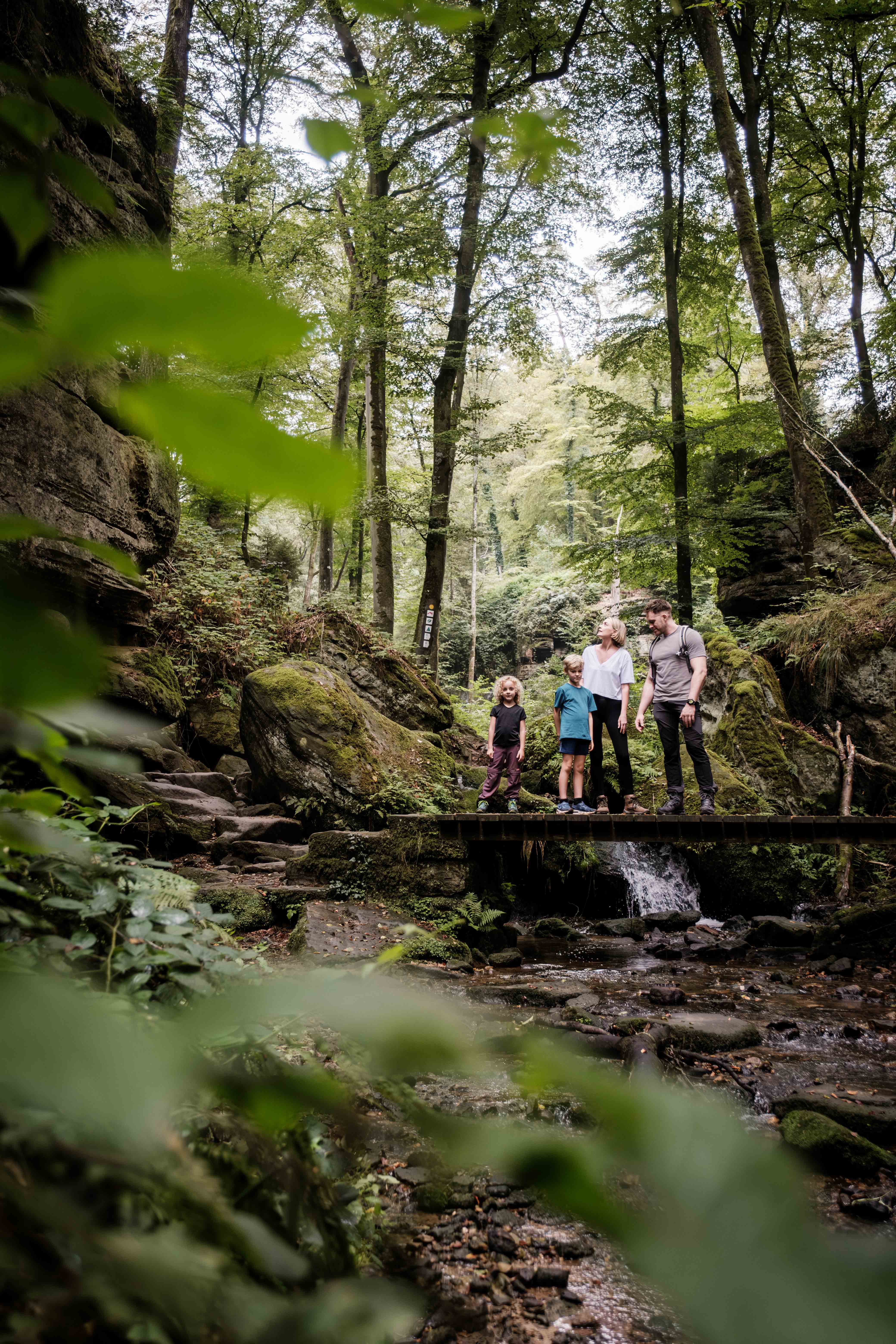 Eine Wanderung entlang der wildromantischen, sprudelnden Bäche Haupeschbaach und Halerbaach führt durch typische, V-förmige Täler. Diese Form entsteht durch die Verwitterung der Felswände. Das verwitterte Material, das von den Felswänden herabfällt, bedeckt den Fuß der steilen Felswände aus Sandstein mit sandigem und steinigem Hangschutt. Zahlreiche Quellen treten aus dem Sandstein aus und speisen die Bäche, sodass die Landschaft vom Wasser geprägt und es im Tal auch an heißen Sommertagen angenehm kühl ist. Den Wanderer erwarten viele kleine Holzbrücken, die den Bach überqueren, und eine einzigartige Landschaft aus moosbewachsenen Felsen.